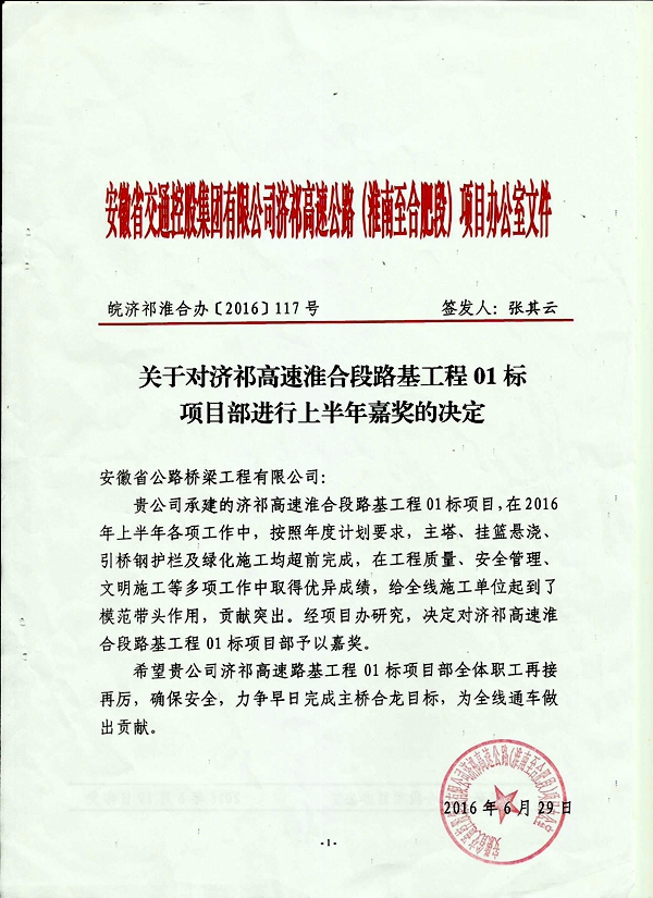 近日,濟(jì)祁高速淮合段項(xiàng)目辦對(duì)公司承建的濟(jì)祁高速淮河橋項(xiàng)目予以嘉獎(jiǎng),表彰該項(xiàng)目在2016年上半年工程質(zhì)量、進(jìn)度方面取得的佳績(jī)。其中特別指出,淮河橋項(xiàng)目嚴(yán)格按照業(yè)主年度計(jì)劃要求,主塔、掛籃懸澆、引橋鋼護(hù)欄及綠化施工均超前完成,同時(shí)在安全管理、文明施工等多項(xiàng)工作中也取得優(yōu)異成績(jī),給全線施工單位起到了模范帶頭作用。