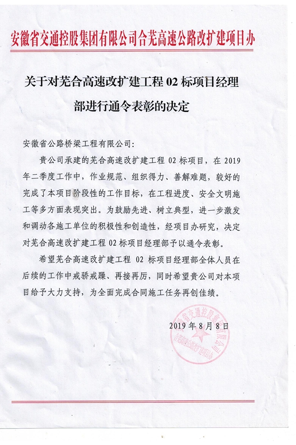 近日,合蕪02標收到來自項目辦簽發(fā)的通令表彰文件,對項目在二季度較好完成階段性工作目標給予肯定,對項目工程進度、安全文明施工等方面取得的突出成績表示贊揚。