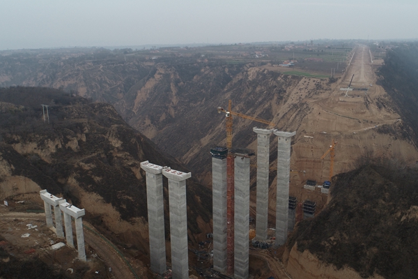 新城溝大橋作為項(xiàng)目控制性工程,長(zhǎng)度不到400m的深溝內(nèi)作業(yè)面狹小,附近便道又陡又窄,人員、機(jī)械、材料運(yùn)輸困難,溝中的10個(gè)空心薄壁墩最高達(dá)到78米。為做到“又好又快”施工,技術(shù)人員經(jīng)過(guò)調(diào)查和方案比選,采用翻模施工工藝與高墩自動(dòng)噴淋養(yǎng)生技術(shù),在保證工期的同時(shí)做到墩身外觀質(zhì)量及實(shí)體強(qiáng)度滿足設(shè)計(jì)要求。過(guò)程中,大家克服數(shù)道難關(guān),鉚足了勁與時(shí)間賽跑,提前完成橋梁下構(gòu)施工任務(wù),為后續(xù)架梁和橋面系施工贏得了有效時(shí)間。