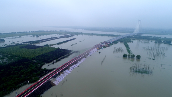 八百里巢湖,水位連續(xù)多日超百年一遇標(biāo)準。7月22日深夜,由安徽路橋市政分公司黨員職工組成的抗洪搶險突擊隊緊急集結(jié)到環(huán)巢湖大道杭埠河大橋處,筑壩固堤,抗洪搶險,打響蓄洪道路保通攻堅戰(zhàn)。經(jīng)過三天三夜的連續(xù)奮戰(zhàn),筑起了一條長600米、寬12米、高4.5米的“紅色堤壩”。