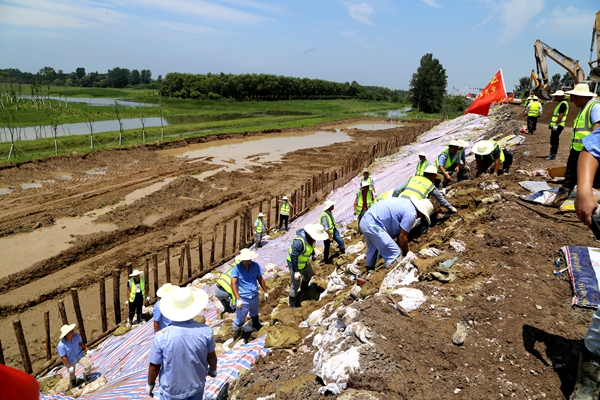 25日7時,市政分公司再次組織400多名職工增援現(xiàn)場。他們中有的是剛從其他抗洪點轉(zhuǎn)戰(zhàn)過來的,有的是主動放棄休假時間請戰(zhàn)過來的,他們的任務(wù)就是完成防浪護坡工作。隨著一根根木樁打下去、一張張雨布蓋下來、一袋袋沙土堆起來,堤壩變得更加穩(wěn)固。