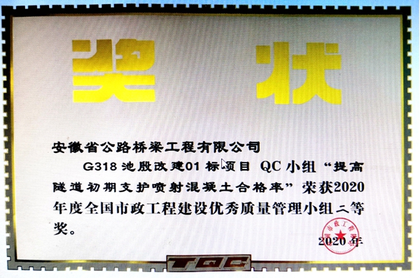 近日,從中國(guó)市政工程協(xié)會(huì)傳來喜訊,道路分公司G318池殷改建01標(biāo)QC小組申報(bào)的《提高隧道初期支護(hù)噴射混凝土合格率》課題,榮獲2020年度全國(guó)市政工程建設(shè)優(yōu)秀質(zhì)量管理小組二等獎(jiǎng)。此前,該項(xiàng)課題還榮獲了安徽省市政工程建設(shè)優(yōu)秀QC小組一等獎(jiǎng)、安徽省建設(shè)行業(yè)質(zhì)量與安全協(xié)會(huì)QC成果二等獎(jiǎng)、合肥市市政工程建設(shè)管理小組一等獎(jiǎng)等多項(xiàng)殊榮。