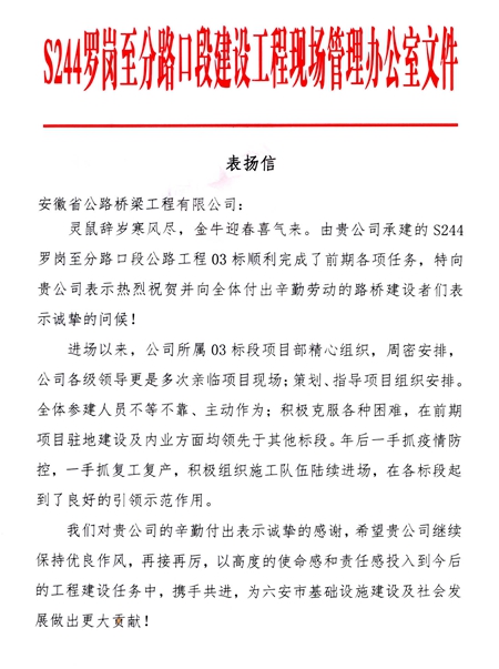 近日,六安市S244羅崗至分路口段建設(shè)工程現(xiàn)場(chǎng)辦發(fā)來表?yè)P(yáng)信,對(duì)公司承建的03標(biāo)項(xiàng)目順利完成前期各項(xiàng)任務(wù)給予高度認(rèn)可并通報(bào)表?yè)P(yáng)。