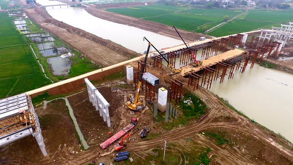 3月18日, 徽州大道項(xiàng)目羅埠河特大橋首件鋼箱梁吊裝成功。