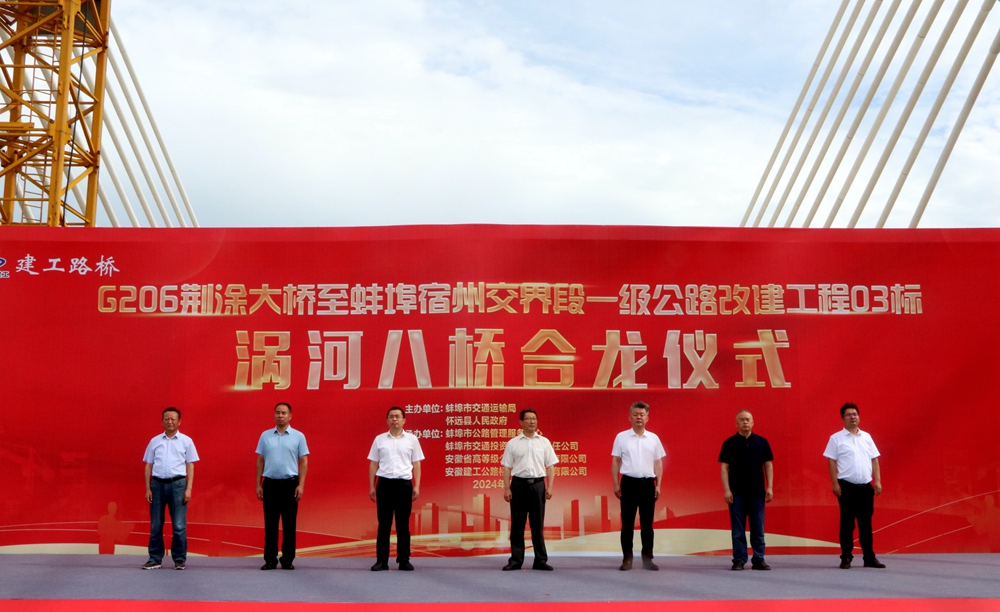 7月20日上午,G206-03標渦河八橋主橋順利合龍。蚌埠市副市長張銘出席合龍儀式并宣布大橋正式合龍,蚌埠市政府副秘書長張圣輝主持合龍儀式,蚌埠市交通運輸局黨委書記、局長戴勇,懷遠縣副縣長趙樹建,公司黨委書記、董事長錢申春出席合龍儀式并分別致辭。