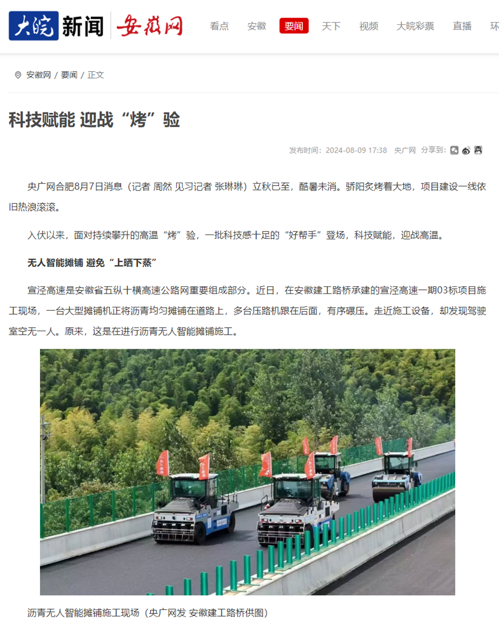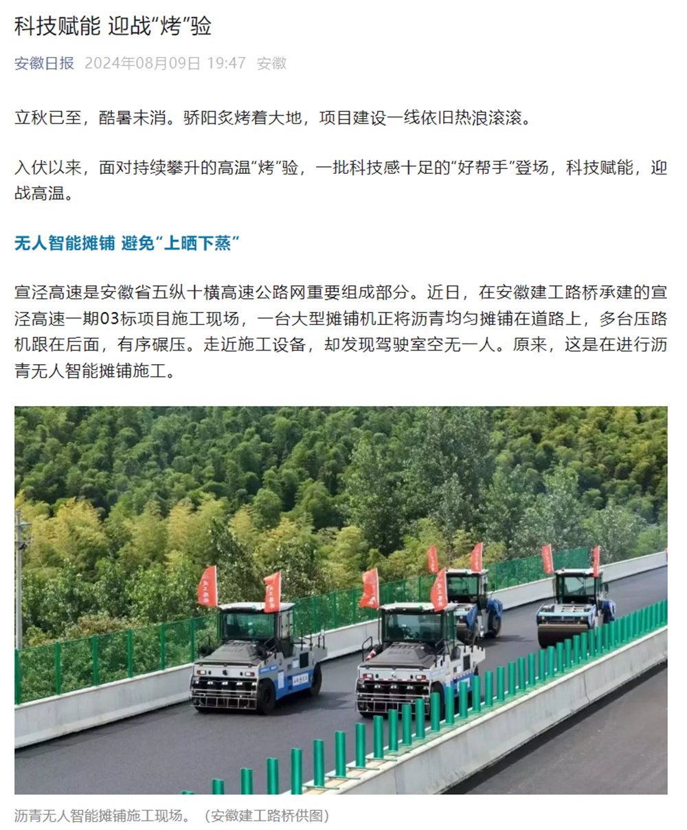 宣涇高速是安徽省五縱十橫高速公路網(wǎng)重要組成部分。近日,在安徽建工路橋承建的宣涇高速一期03標(biāo)項(xiàng)目施工現(xiàn)場,一臺大型攤鋪機(jī)正將瀝青均勻攤鋪在道路上,多臺壓路機(jī)跟在后面,有序碾壓。走近施工設(shè)備,卻發(fā)現(xiàn)駕駛室空無一人。原來,這是在進(jìn)行瀝青無人智能攤鋪施工。