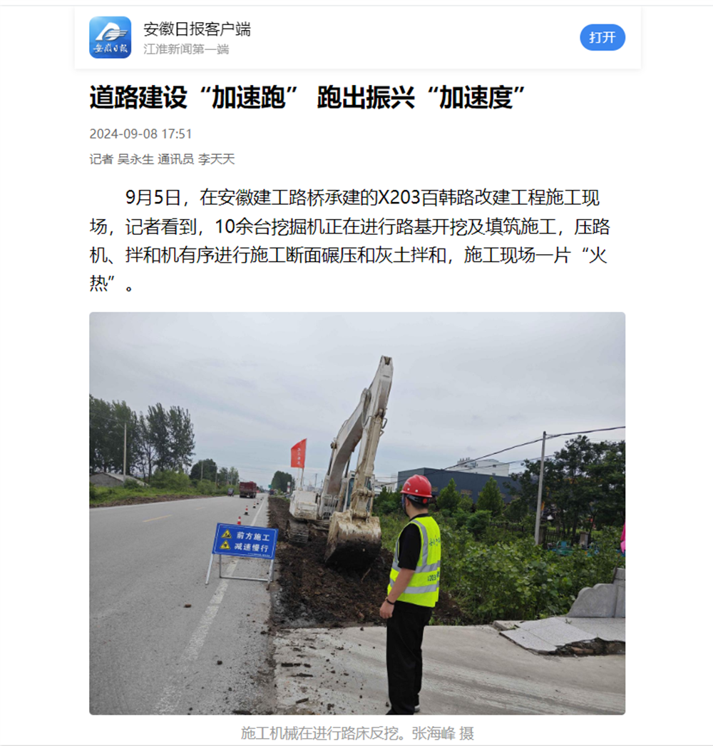 【名媒聚焦】安徽日報(bào)客戶端:X203百韓路改建工程——道路建設(shè)“加速跑” 跑出振興“加速度”
