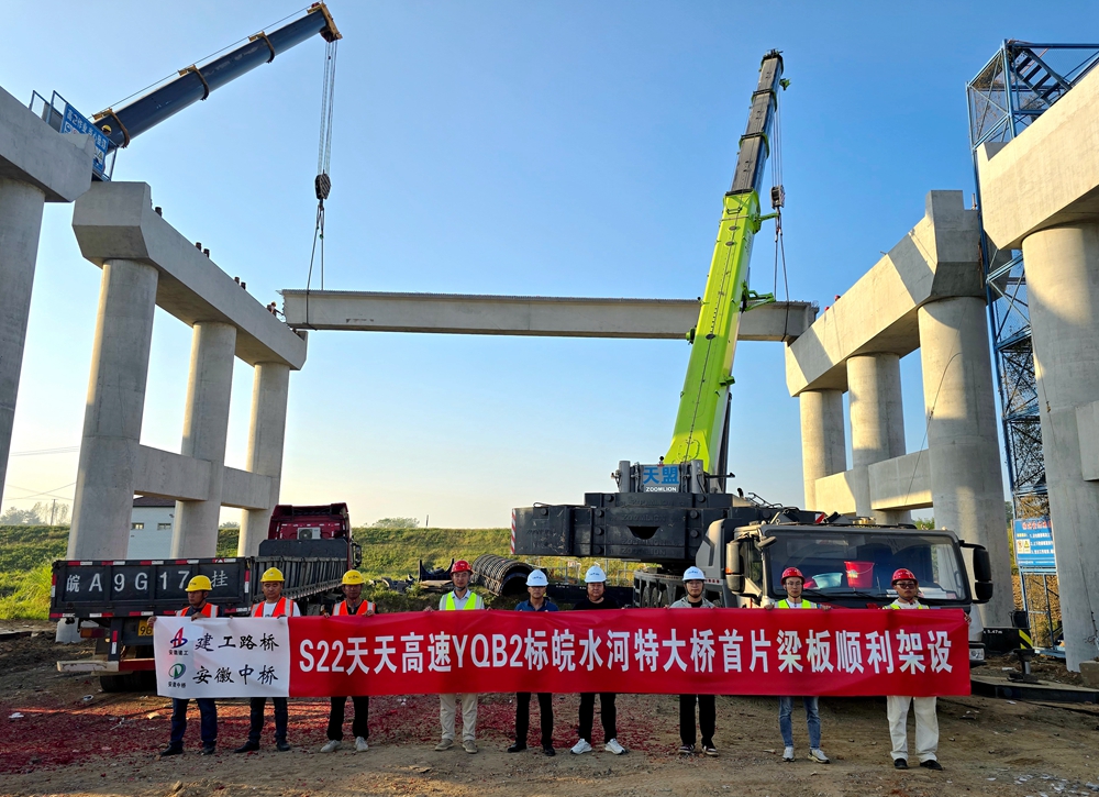 在S22天天高速YQB2標(biāo)關(guān)鍵控制性工程——皖水河特大橋施工現(xiàn)場,項(xiàng)目部緊盯施工節(jié)點(diǎn),壓實(shí)責(zé)任抓落實(shí),順利完成首片預(yù)制箱梁架設(shè)。