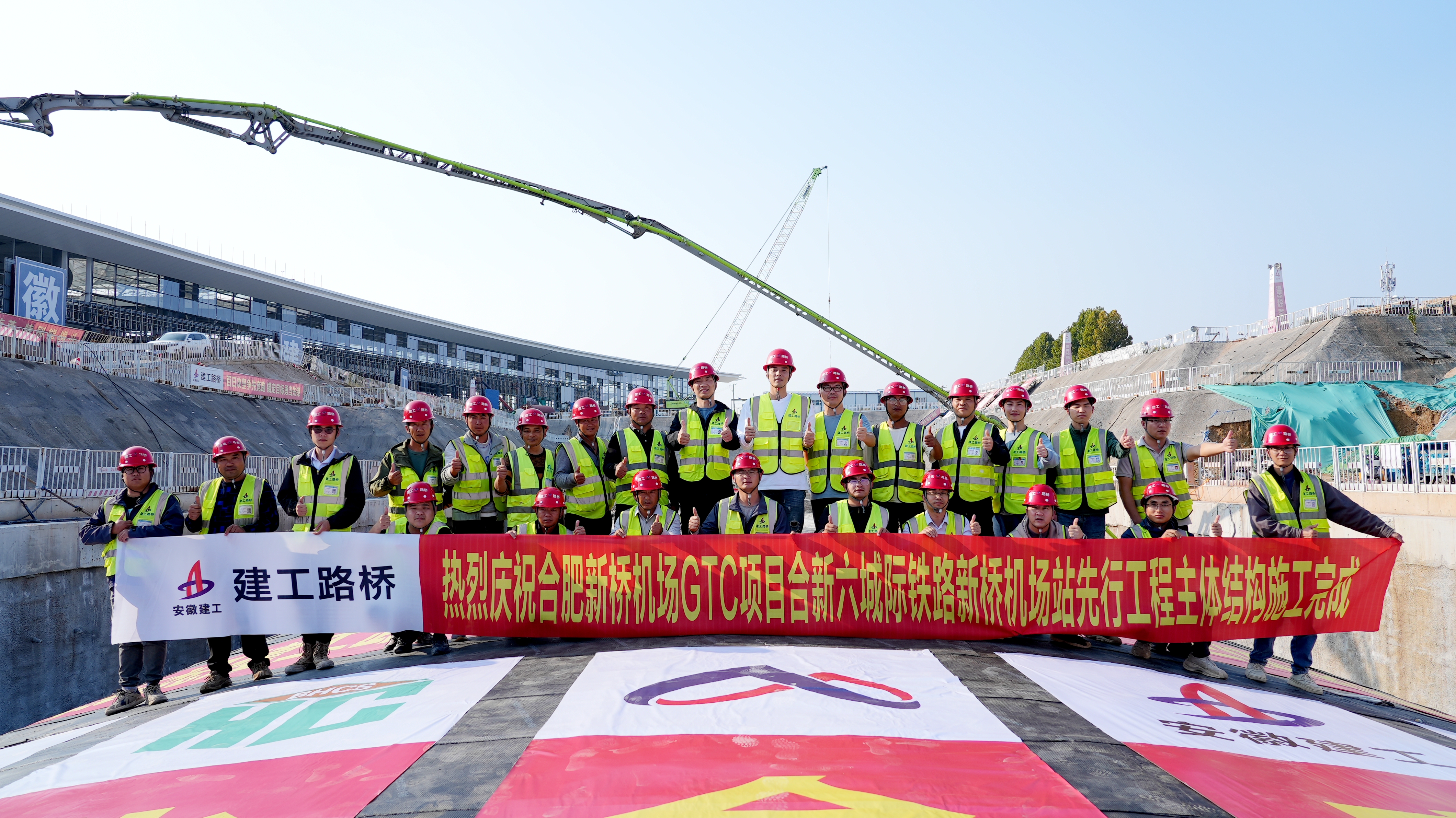合肥新橋機(jī)場(chǎng)綜合交通中心項(xiàng)目合新六城際鐵路新橋機(jī)場(chǎng)站先行工程順利封頂