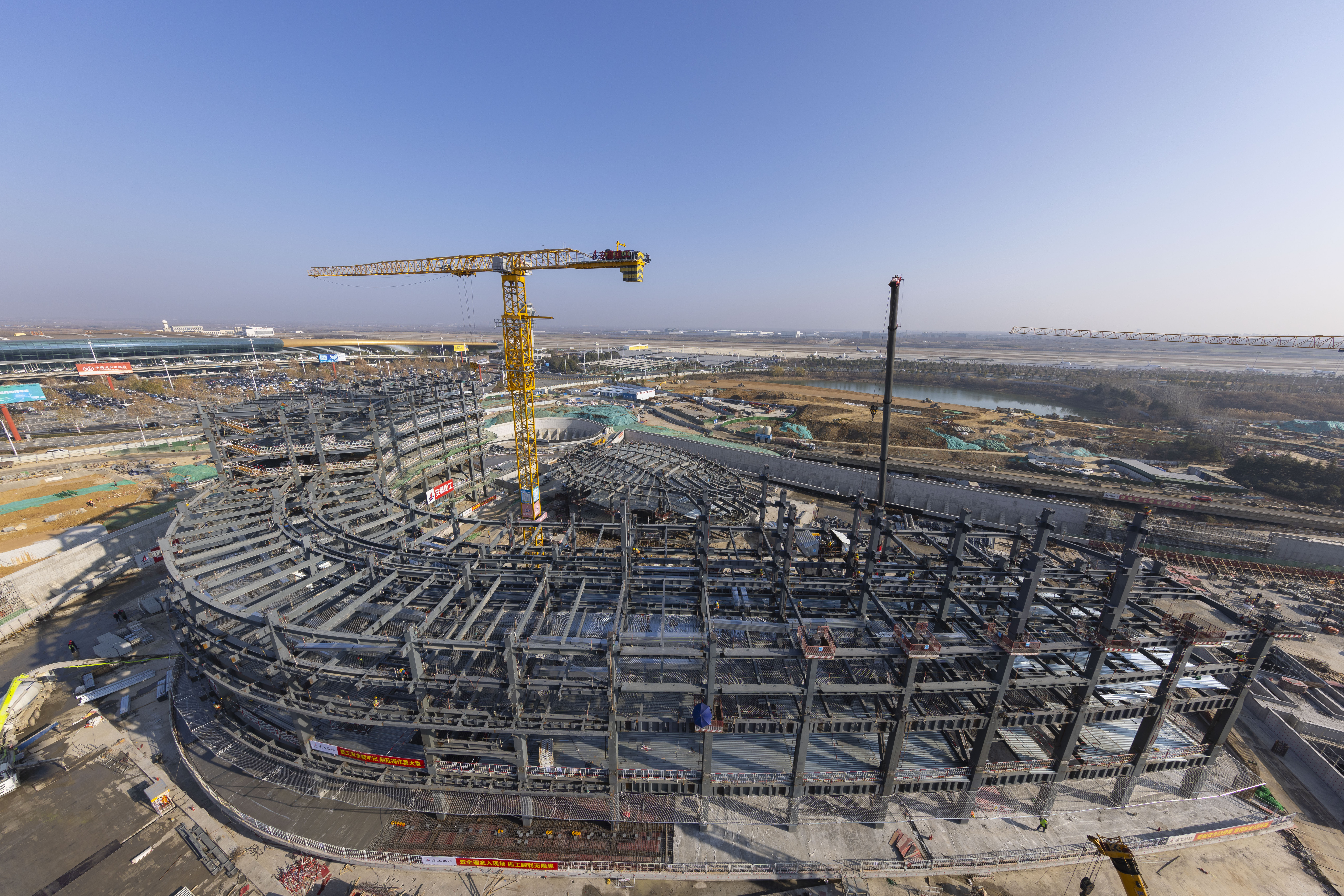 1月5日,合肥新橋國際機場改擴建工程現(xiàn)場,安徽建工集團的工人正在施工。當前合肥新橋國際機場改擴建工程正穩(wěn)步推進中。T2航站樓正全面推進屋面鋼結構、幕墻和二次結構砌筑施工,同步推進機電安裝。綜合交通中心項目主體結構已全面封頂。