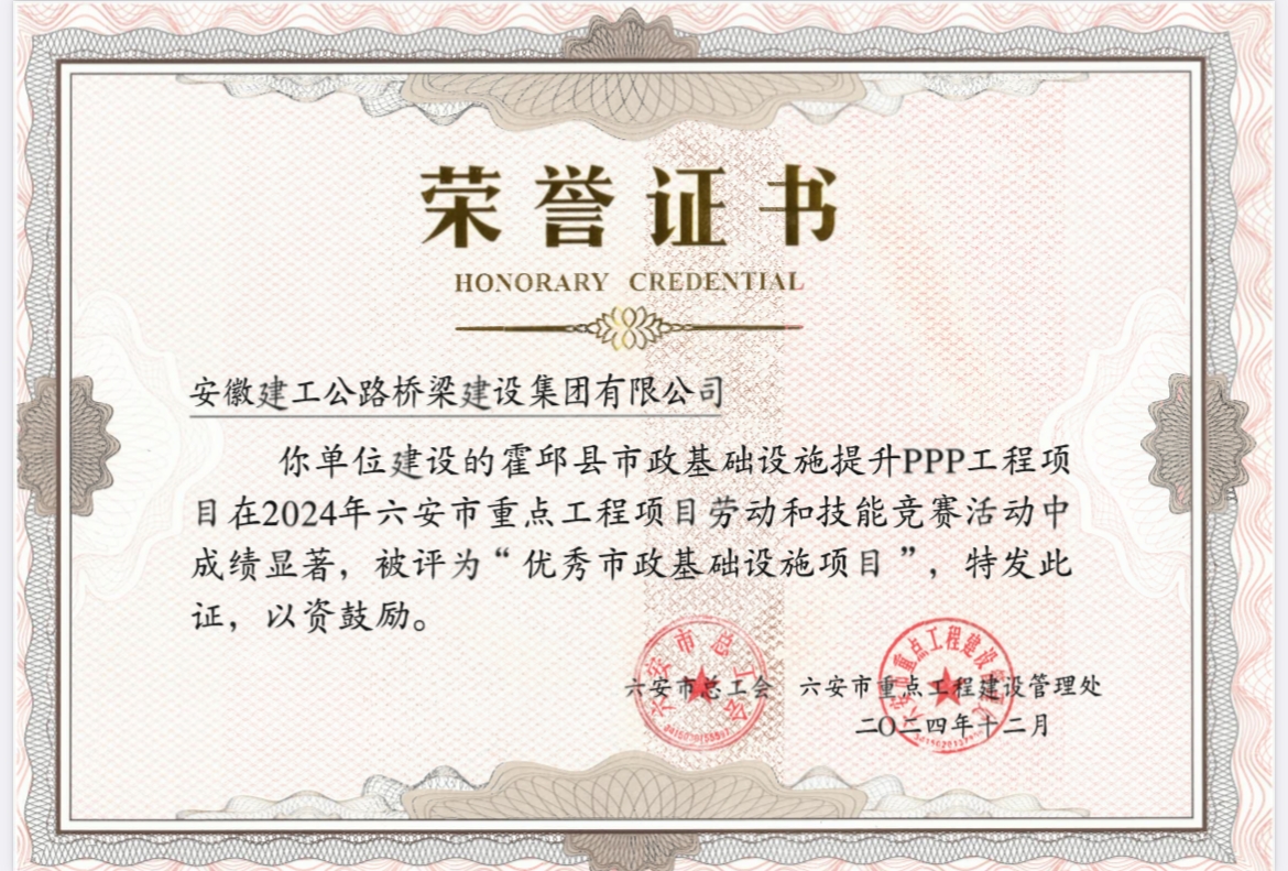 近日,“建功新時代 奮進新征程”2024年六安市重點工程項目勞動和技能競賽成果公布,霍邱PPP項目榮獲“優(yōu)秀市政基礎(chǔ)設(shè)施項目”榮譽稱號。