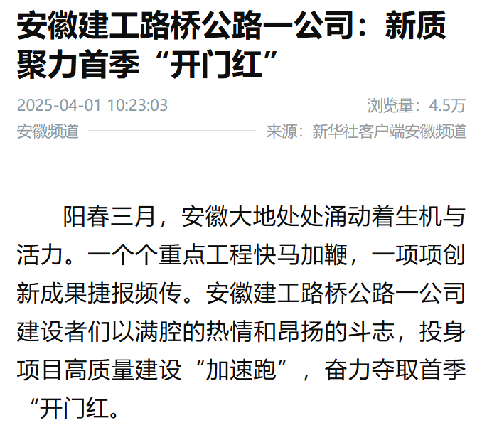【央媒聚焦】新華社客戶端:安徽建工路橋公路一公司——新質(zhì)聚力首季“開門紅”
