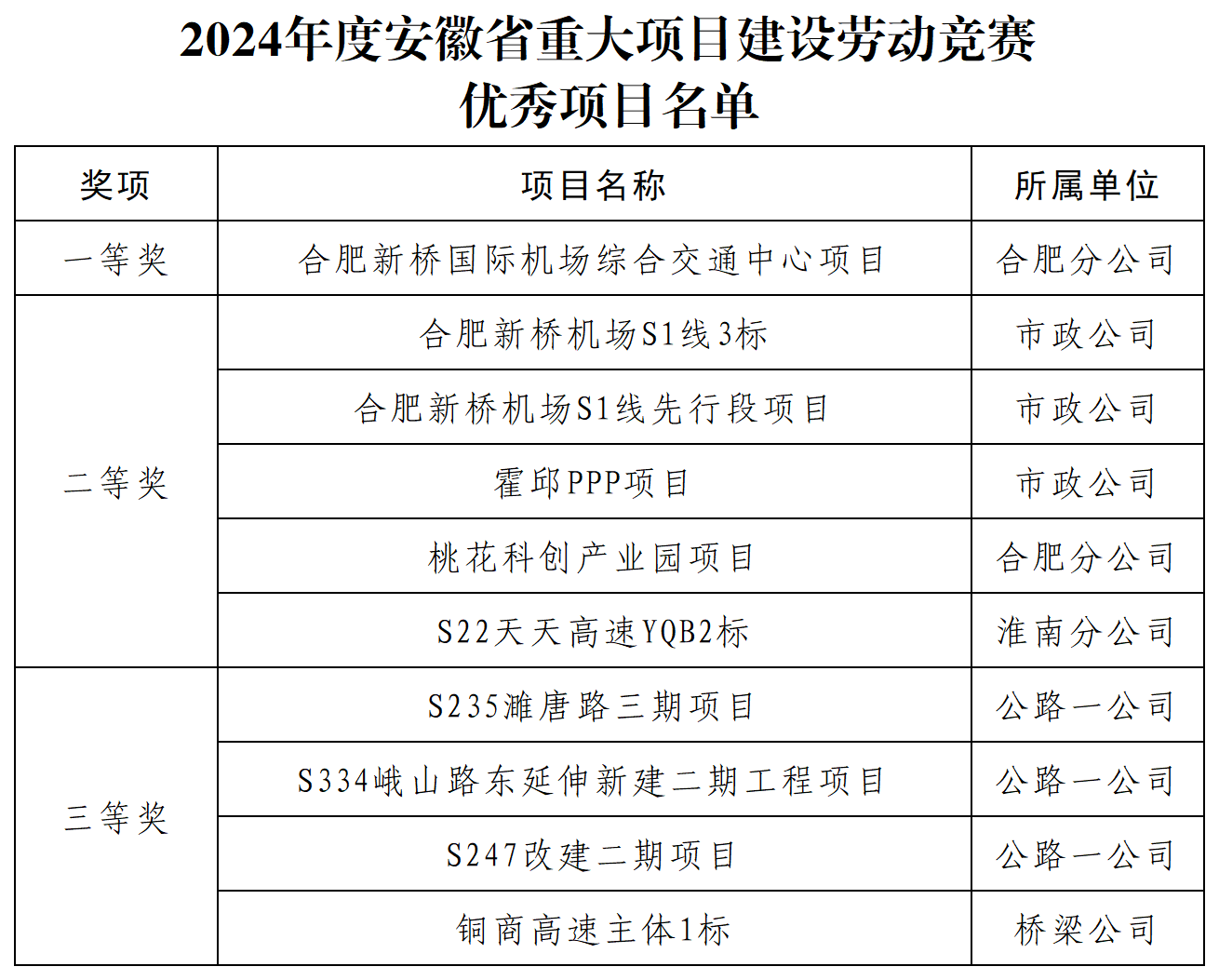 近日,安徽省住建廳與省總工會對2024年度重大項目建設(shè)勞動競賽參賽項目進(jìn)行了通報表揚(yáng),公司承建的合肥新橋國際機(jī)場綜合交通中心項目、S1線3標(biāo)等10個項目榮獲優(yōu)秀項目稱號。