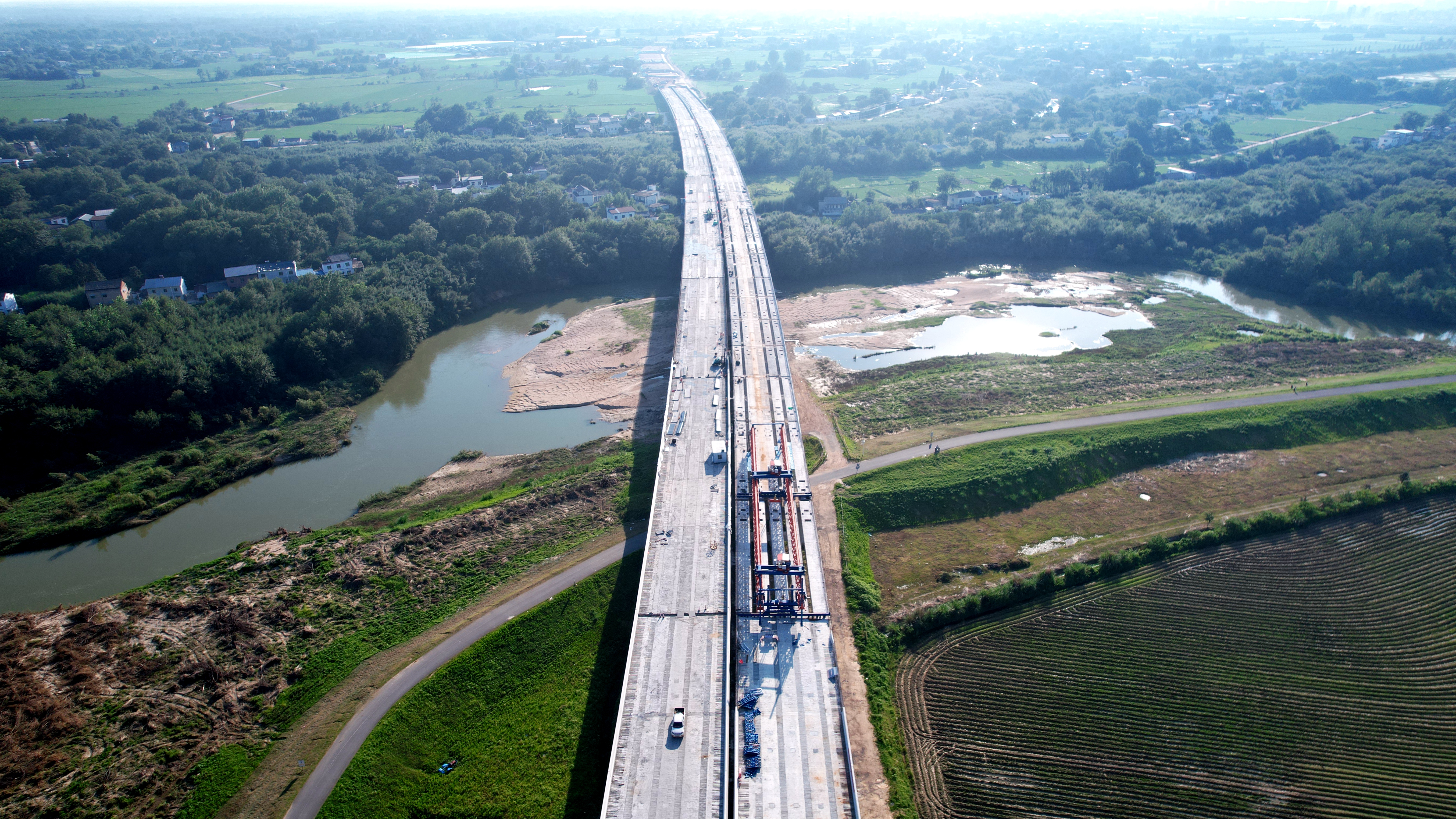 皖水河特大橋全長3.59公里。橋梁需橫跨皖水河、梅河、珠流河三條河流,不僅要應(yīng)對復(fù)雜的水文地質(zhì)條件,還要克服季節(jié)性洪水等不利因素,項目團(tuán)隊創(chuàng)新采用提梁站提梁、架橋機(jī)與汽車吊協(xié)同作業(yè)的施工方式,大幅縮短了皖水河特大橋的梁板架設(shè)工期,為項目全線通車按下“加速鍵”。