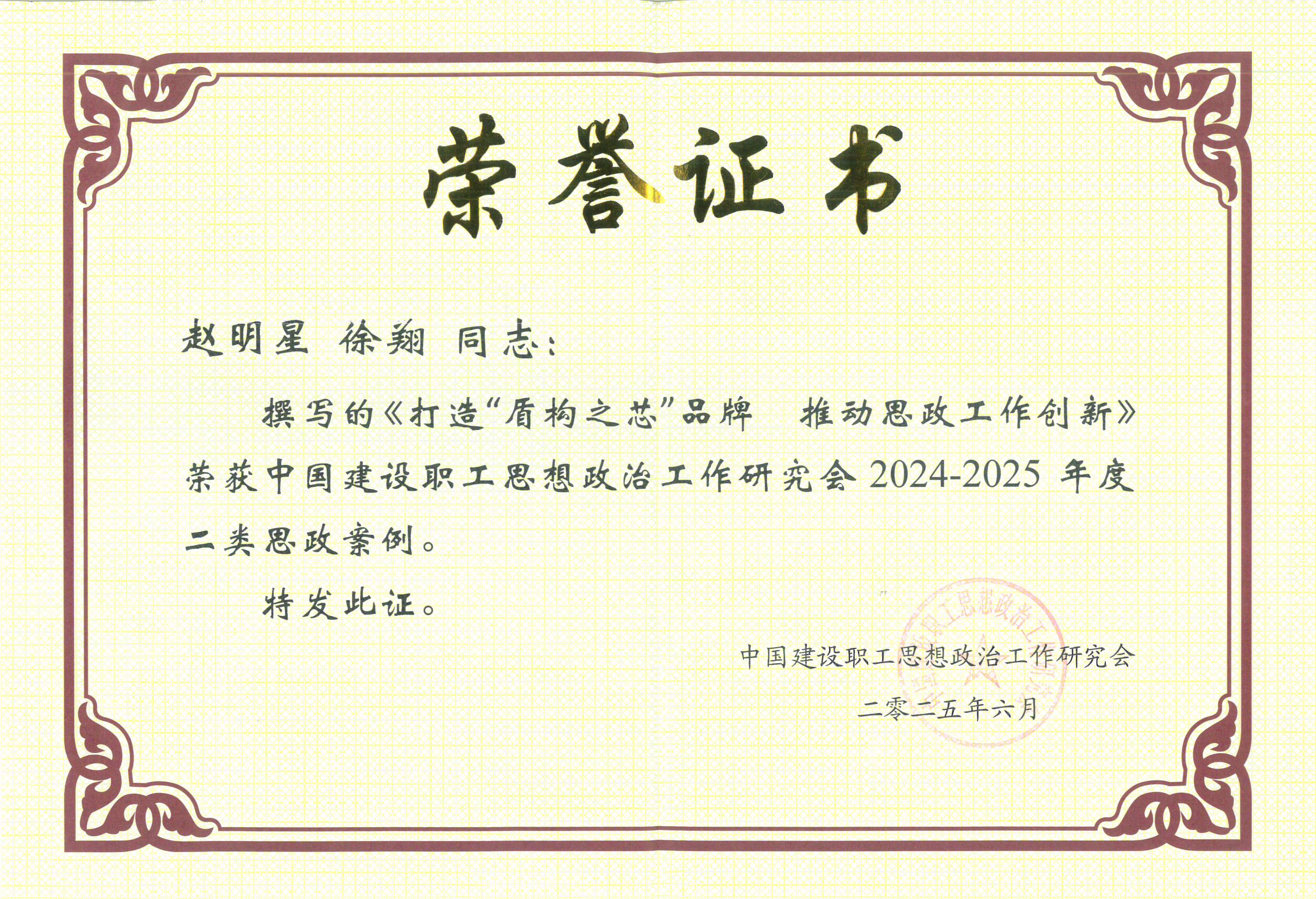 近日,中國思想政治工作研究會公布2024-2025年度中國建設職工思想政治研究會研究成果和創(chuàng)新案例表彰結果,公司報送的《打造“盾構之芯”品牌 推動思政工作創(chuàng)新》獲評二類創(chuàng)新案例。