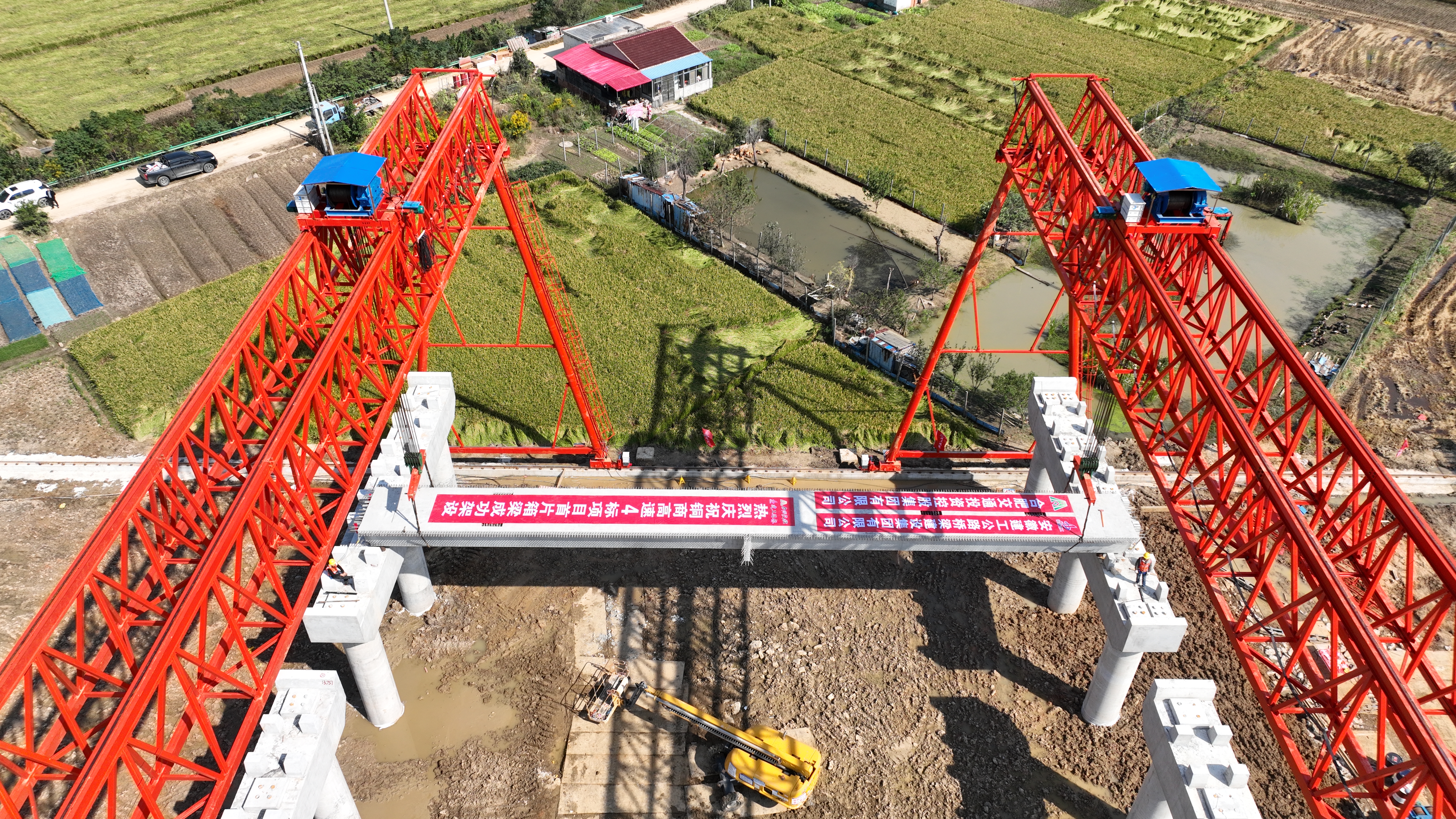 本次作業(yè)箱梁長(zhǎng)30米,重達(dá)99.32噸。為確保預(yù)制箱梁順利架設(shè),項(xiàng)目部在正式起吊前進(jìn)行了嚴(yán)格的試吊檢驗(yàn),有效把控箱梁施工質(zhì)量。同時(shí),對(duì)設(shè)備與吊具安全性進(jìn)行了全面排查,并不斷優(yōu)化運(yùn)架梁方案,全力保障了施工過(guò)程中的質(zhì)量穩(wěn)定與作業(yè)安全。此外,項(xiàng)目在杭埠河南北兩岸同步增置了2個(gè)提梁點(diǎn),形成“南北兩岸同步發(fā)力、雙點(diǎn)作業(yè)”的架設(shè)格局,有效提升了施工效率。