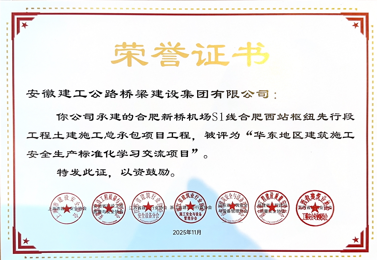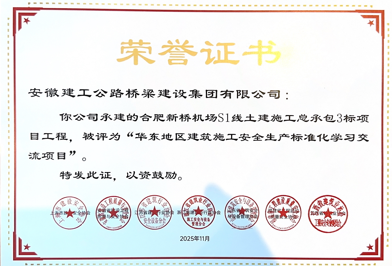 近日,華東地區(qū)建筑安全聯(lián)席會(huì)公布了“2025年度華東六省一市建筑施工安全生產(chǎn)標(biāo)準(zhǔn)化工地學(xué)習(xí)交流項(xiàng)目名單”,公司承建的合肥新橋機(jī)場(chǎng)S1線(xiàn)土建施工總承包3標(biāo)、合肥新橋機(jī)場(chǎng)S1線(xiàn)合肥西站樞紐先行段工程土建施工總承包項(xiàng)目光榮上榜。邵嘉兵、宋廣輝獲評(píng)優(yōu)秀項(xiàng)目經(jīng)理稱(chēng)號(hào),李蘇蘇、段興一獲評(píng)優(yōu)秀項(xiàng)目安全總監(jiān)稱(chēng)號(hào)。