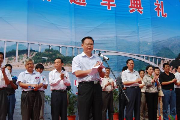 金寨縣委書(shū)記沙洪虎在講話中高度贊揚(yáng)了我公司講政治、重大局、作奉獻(xiàn)的精神。省公路局秦勤局長(zhǎng)在代表梅勁廳長(zhǎng)的講話中指出,金桃大橋的建成具有極為重要的政治、經(jīng)濟(jì)意義,大橋在施工中填補(bǔ)了省內(nèi)橋梁施工技術(shù)的數(shù)項(xiàng)空白,該橋建成后將大大改善當(dāng)?shù)貒?yán)重落后的交通狀況,對(duì)促進(jìn)當(dāng)?shù)氐慕?jīng)濟(jì)發(fā)展,提高人民群眾生活水平,造福老區(qū)人民具有極其重要的意義。