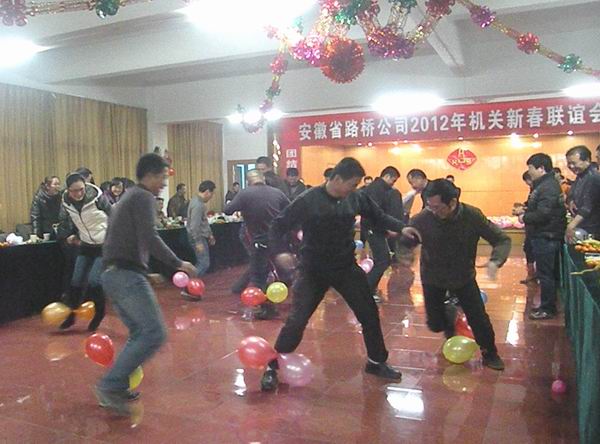聯(lián)歡會(huì)上,公司黨委書(shū)記陳光磊致新年賀詞,祝所有員工節(jié)日快樂(lè)。本次聯(lián)歡會(huì)把公司領(lǐng)導(dǎo)和機(jī)關(guān)員工分成四個(gè)代表隊(duì)進(jìn)行游戲,每個(gè)游戲根據(jù)結(jié)果評(píng)定得分,所有游戲結(jié)束后,根據(jù)得分多少評(píng)定獎(jiǎng)項(xiàng)。