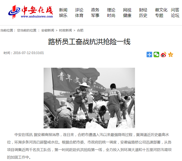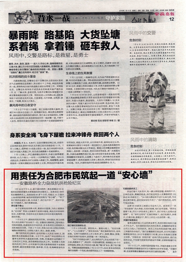 近日,公司積極響應(yīng)合肥市委、市政府號召,全力參與環(huán)湖大道和十五里河抗洪搶險的事跡得到社會的高度關(guān)注。7月12日、13日,中安在線、《安徽商報》等多家省級媒體對公司抗洪搶險事跡進(jìn)行了連續(xù)報道。