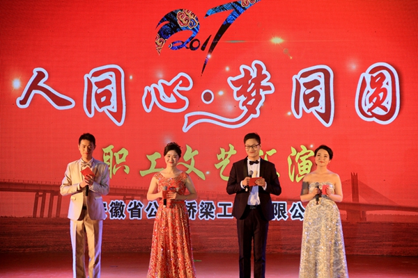 演出現(xiàn)場二樓眺臺正上方懸掛著醒目的橫幅:“堅持創(chuàng)新引領(lǐng) 搶抓發(fā)展機遇 為早日實現(xiàn)‘兩個超百億’目標(biāo)而努力奮斗”,舞臺正中,“人同心 夢同圓”的晚會主題熠熠生輝。公司黨委書記、董事長、總經(jīng)理孫學(xué)軍在致辭中指出,2016年,在建工集團黨委的正確領(lǐng)導(dǎo)下,公司迎來了發(fā)展史上具有里程碑意義的一年,公路工程施工總承包特級資質(zhì)和行業(yè)工程設(shè)計甲級資質(zhì)順利獲批,發(fā)展質(zhì)量大幅提升,競爭力、影響力不斷增強,職工文化生活豐富多彩,企業(yè)活力、凝聚力進一步增強,這是廣大職工共同奮斗的結(jié)果,他代表公司黨委和領(lǐng)導(dǎo)班子向全體職工及家屬表示衷心的感謝和崇高的敬意。對下一步工作,孫學(xué)軍強調(diào),2017年,要充分發(fā)揮特級資質(zhì)優(yōu)勢,總結(jié)提升信息化建設(shè),繼續(xù)完善各項基礎(chǔ)管理,進一步加強企業(yè)凝聚力,繼續(xù)推進公司改革發(fā)展事業(yè)向前發(fā)展。