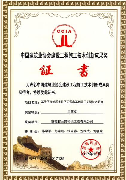 日前,中國建筑業(yè)協(xié)會公布了2017年建設(shè)工程施工技術(shù)創(chuàng)新成果獲獎名單,公司組織申報的《基于不良地質(zhì)條件下的深水基礎(chǔ)施工關(guān)鍵技術(shù)研究》榮獲三等獎。