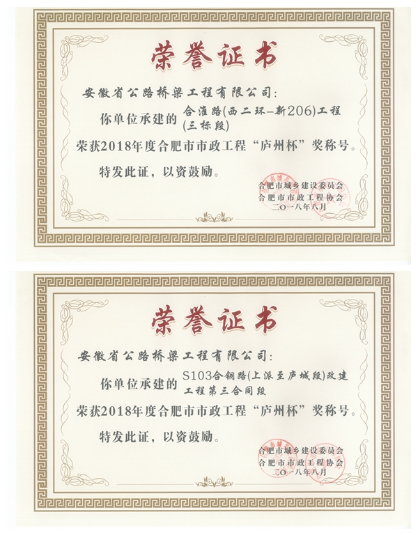 近日,從合肥市市政工程協(xié)會傳來喜訊,安徽路橋公司承建的S103合銅路(上派至廬城段)改建工程、合淮路(西二環(huán)-新206)三標(biāo)兩項(xiàng)工程經(jīng)合肥城鄉(xiāng)建委審定,榮獲2018年度合肥市政工程“廬州杯”獎。