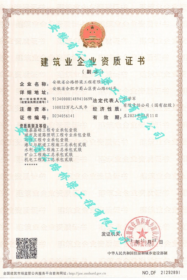 11月28日,公司地基基礎(chǔ)工程專(zhuān)業(yè)承包壹級(jí)、城市道路照明工程專(zhuān)業(yè)承包壹級(jí)、礦山工程施工總承包貳級(jí)三項(xiàng)資質(zhì)順利通過(guò)安徽省住房和城鄉(xiāng)建設(shè)廳審查核準(zhǔn)。