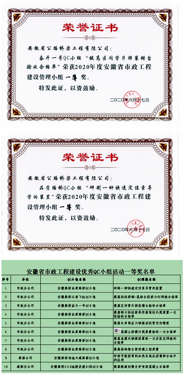 公司10項(xiàng)QC成果榮獲安徽省市政工程建設(shè)優(yōu)秀QC小組活動一等獎