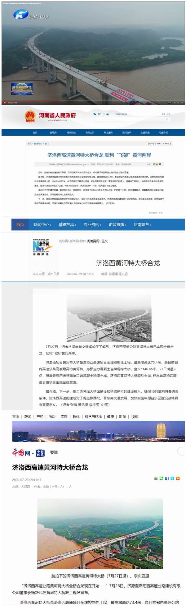 7月26日至27日,中新社、河南衛(wèi)視、河南日報(bào)、東方今報(bào)等多家省部級主流媒體,深入濟(jì)洛西高速黃河特大橋施工現(xiàn)場,現(xiàn)場采訪并共同見證了目前河南省內(nèi)墩高最高的黃河特大橋合龍。