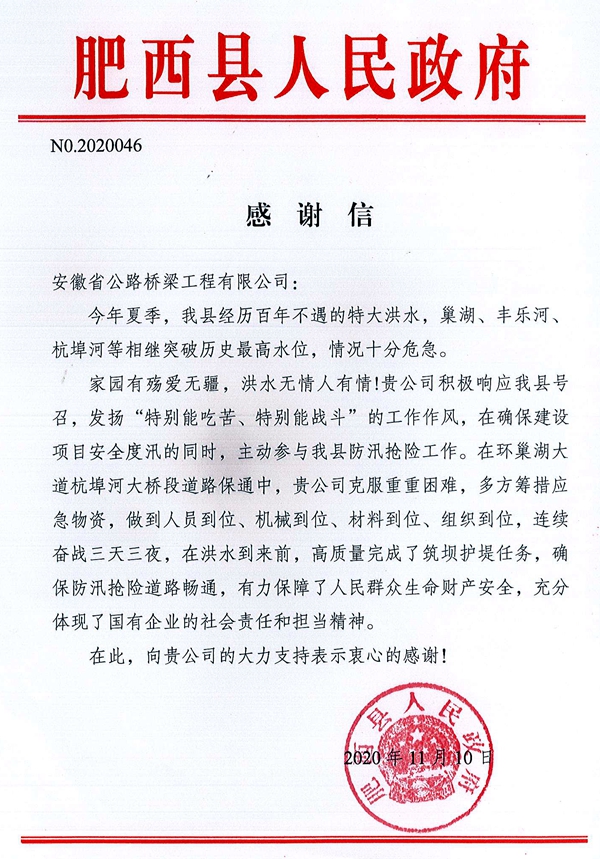 11月10日,肥西縣人民政府給公司送來一封感謝信,高度贊揚(yáng)公司在防汛搶險(xiǎn)工作中的突出貢獻(xiàn)和國企擔(dān)當(dāng)精神,并向公司致以衷心感謝。