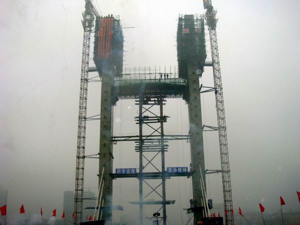 作為整座大橋的控制性工程,主索塔施工一直是各方關(guān)注的焦點(diǎn),并成為影響我項(xiàng)目總體施工進(jìn)度的主要因素。為此,項(xiàng)目部領(lǐng)導(dǎo)班子經(jīng)過多次研究分析并大膽決策,決定改變以前多點(diǎn)開花,齊頭并進(jìn)的工作方向,將工作重心向主索塔偏移,從人員到設(shè)備優(yōu)先滿足主索塔的施工需要。針對施工過程中遇到的技術(shù)難題,項(xiàng)目部及時(shí)邀請有關(guān)專家及公司領(lǐng)導(dǎo)到施工現(xiàn)場指導(dǎo),制定解決方案。在積極趕超進(jìn)度的同時(shí),項(xiàng)目部將安全和質(zhì)量擺放在首要位置。在施工過程中,項(xiàng)目部不僅建立了完善的安全、質(zhì)量保障體系,更積極增加投入,全方位確保主索塔施工質(zhì)量,并使主索塔施工速度得到穩(wěn)步提升。