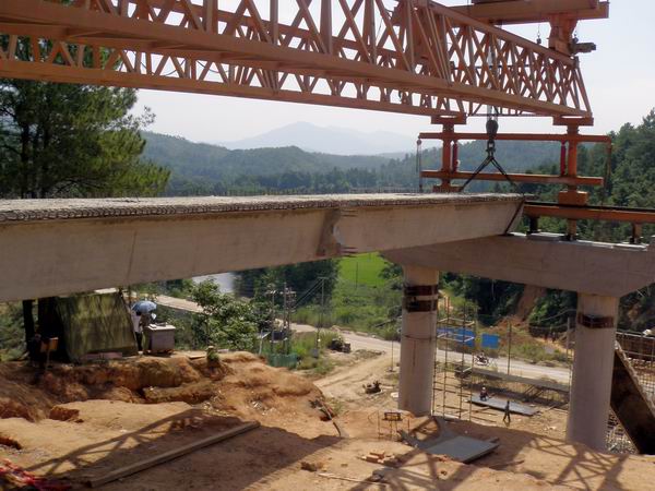 為了確保架梁工作的順利開展,項目部領(lǐng)導(dǎo)到現(xiàn)場指導(dǎo)架橋機(jī)的拼裝、檢驗等工作,通過對架梁人員進(jìn)行分部分項技術(shù)交底,讓所有現(xiàn)場作業(yè)人員都能做到熟捻于心。經(jīng)過施工人員精心施工,努力奮斗,于10月2日完成架橋機(jī)拼裝,10月3日完成調(diào)試。10月5日,在項目部領(lǐng)導(dǎo)、監(jiān)理和駐地辦領(lǐng)導(dǎo)的共同指揮下,我標(biāo)段首片箱梁成功架設(shè)?,F(xiàn)場鞭炮齊鳴,掌聲如雷,為國慶增添新的喜慶。