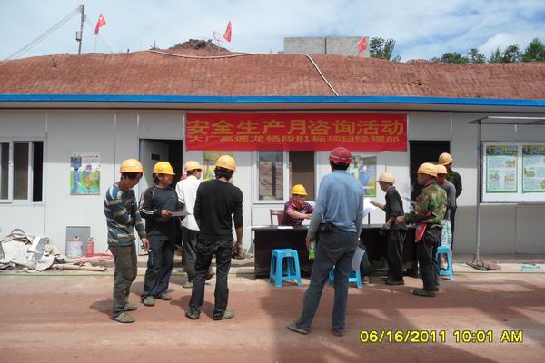 活動(dòng)現(xiàn)場(chǎng)設(shè)置了安全生產(chǎn)教育宣傳欄,懸掛了“安全責(zé)任,重在落實(shí)”等安全宣傳橫幅,張貼了安全生產(chǎn)貼畫,營(yíng)造出了濃厚的安全生產(chǎn)氛圍?,F(xiàn)場(chǎng)擺設(shè)了咨詢臺(tái),放置了安全生產(chǎn)小手冊(cè)(內(nèi)容包括安全生產(chǎn)法律法規(guī)和安全防護(hù)常識(shí))。參加活動(dòng)的一線工人有五十余人,由項(xiàng)目部專職安全員接待現(xiàn)場(chǎng)施工人員的咨詢,對(duì)工人提出的問題積極給予解答,并發(fā)放安全小手冊(cè),詳細(xì)講解了一線工人享有的權(quán)利和應(yīng)盡的責(zé)任、義務(wù),以及在施工中的安全注意事項(xiàng)等。