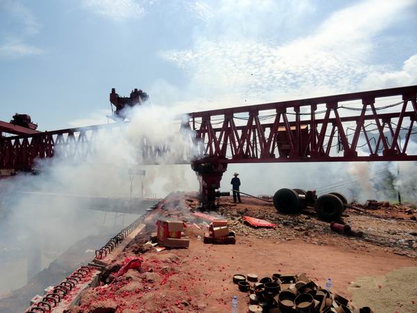 上午10點(diǎn)30分,項(xiàng)目辦、高駐辦等相關(guān)領(lǐng)導(dǎo),在公司總經(jīng)理助理丁世國、項(xiàng)目經(jīng)理羅權(quán)等的陪同下,親臨我盤石分離立交梁板安裝施工現(xiàn)場指導(dǎo)安裝工作。10點(diǎn)40分,架梁工作正式開始,現(xiàn)場頓時鞭炮齊鳴、禮花綻放。 10點(diǎn)58分,首片梁板順利安裝。