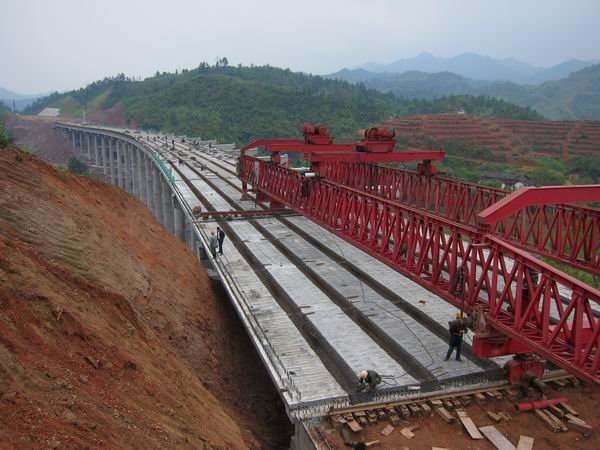 今年贛南雨季較之往年稍微提前,三月雨水繁多,給江口大橋的梁板安裝帶來了很大影響。作為開年施工建設(shè)中的控制性施工點,我部積極采取多種措施,在確保施工安全和工程質(zhì)量的前提下,大力推進梁板安裝施工進度。項目部成立以項目經(jīng)理為組長的梁板安裝工作組,搶抓有利天氣開展安裝工作,于2012年3月26日創(chuàng)造全線單天安裝10片30米T梁的記錄(包括架橋機過孔),扎扎實實的把工作落在實處,為我部完成江口大橋的半幅貫通奠定了堅實基礎(chǔ)。