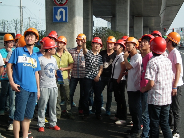 下午15:00,在項目部會議室,該項目總工利用PPT圖文并茂的給學生們介紹了阜陽北路高架工程概況、施工工藝、工程質量控制。隨后,學生們來到施工現場,該項目總工將學校中學習到的理論知識與現場施工實際相結合,對阜陽北路高架橋梁的整個施工工藝流程作了深入淺出的講解。